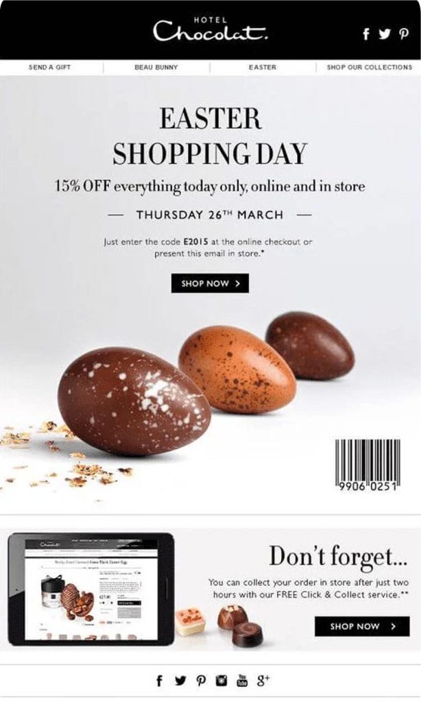 An email from Hotel Chocolate, a fine chocolatery. Try to get the word out about your Easter promotions across multiple platforms to attract more shoppers. Easter marketing ideas are limitless, so just choose what works for you.